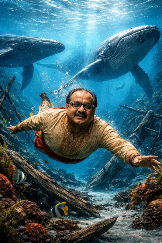 உங்க பேரு நீலத் திமிங்கலம்னு நினைச்சேன் ஆனா நீங்கநீளத் திமிங்கலம் தானே என்றதும் மாரடைப்பில் சிலதிமிங்கலங்கள் இறக்க, தப்பிய திமிங்கலங்கள் இவரை விட்டுவிலகி உசேன் போல்ட் வேகத்தில் நீந்திச் சென்றன. தனதுகண்டு பிடிப்பு குணம் தான் தன்னைக் காப்பாற்றியது என
