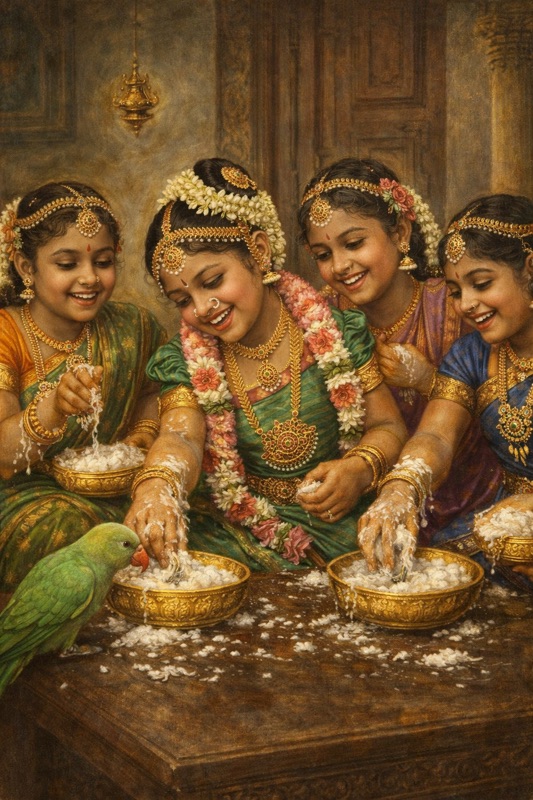 அதுக்கு மேட்ச்சா உயர்ந்த ஆடைகள் இப்படி நகைக் கடை மாடல் போலஅலங்கரித்து வந்து அதன் பிறகே அந்த பால் சோறை அனைவரும் ஒன்றாகக்கூடி சாப்பிட வேண்டுமாம்! இவை அனைத்தும் எதிரிகளை வெல்லும்கோவிந்தனைப் பற்றி பாடி பயனைடைந்து நாங்கள் பெறும் பரிசுகள்என்கிறார். மார்கழி முதல்நாளில் துவக்கிய இந்தப் பாவை நோன்பை 27ஆம்நாளில்..