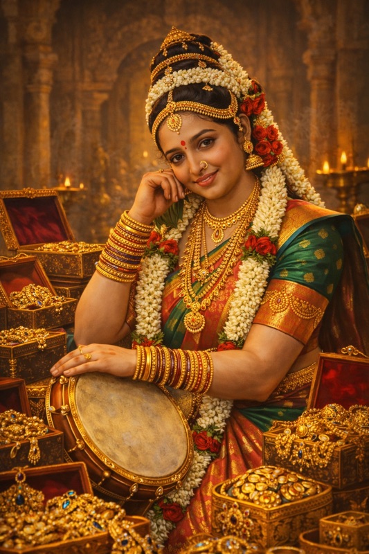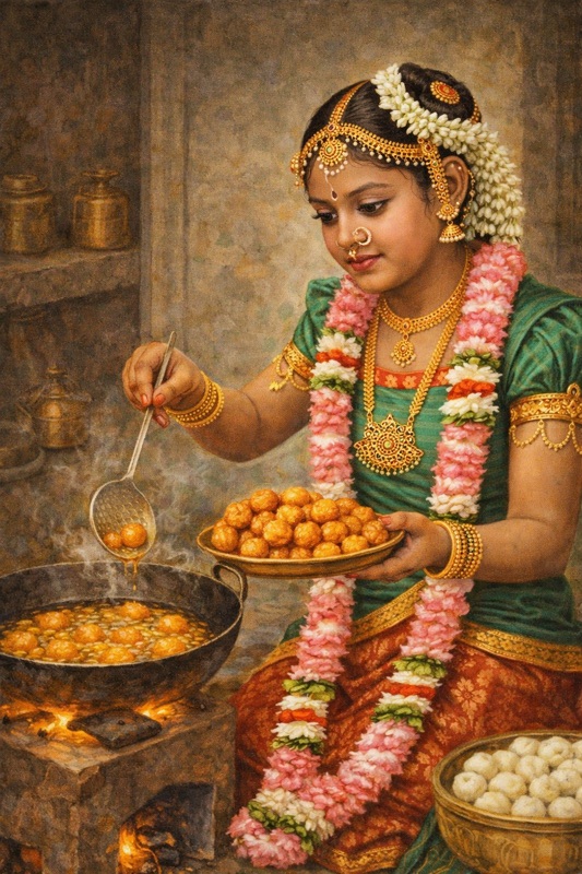 அது மட்டுமா! கண்களில் மை தீட்டக்கூடாது, அலங்காரம் செய்து கொள்ளக்கூடாதென்று சொன்னவர் இந்த உணவை சாப்பிடப் போகும் முன்என்னென்ன ஆடை ஆபரணங்கள் அணியவேண்டும் என ஒருபட்டியலிடுகிறார். கைகளில் தங்கவளைகள், இரு தோள்களிலும் கைவங்கிகள், தங்கப்பூ போன்ற பெரிய தோடுகள், அதற்கு மாட்டல்கள், காலணிகள், இன்னும் பல நகைகள்..